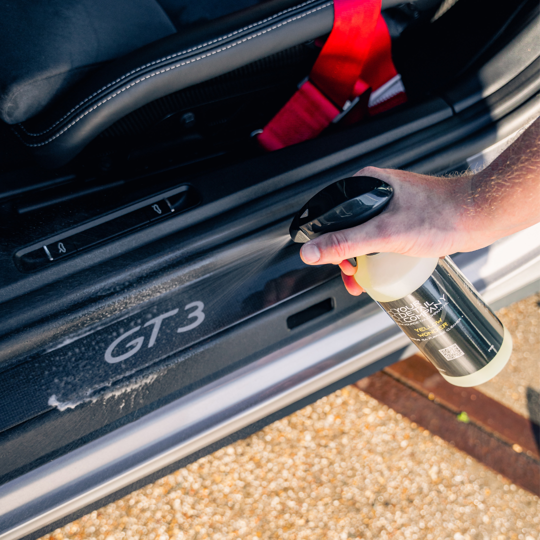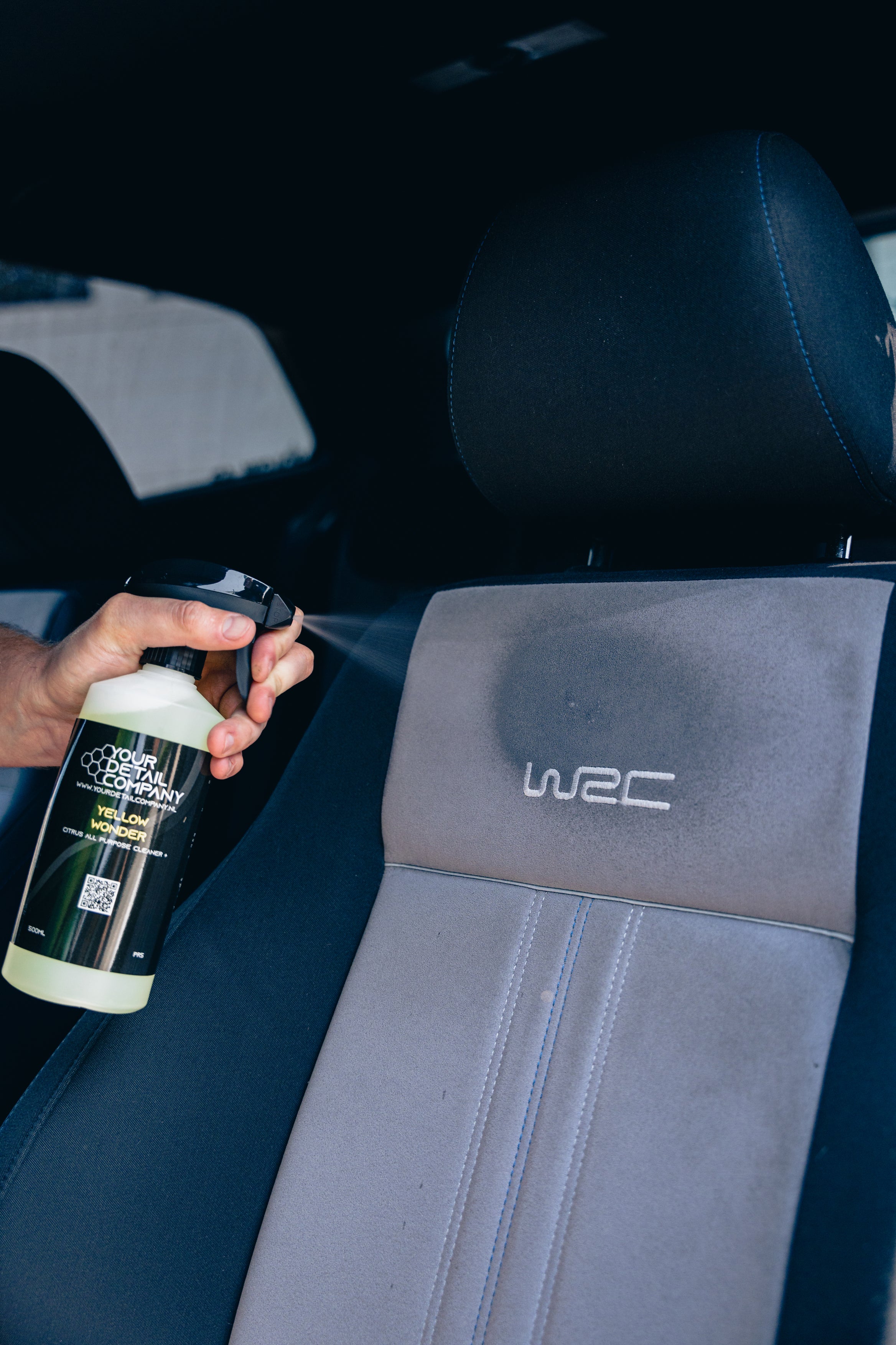 Yellow Wonder is geschikt voor het reinigen van auto-interieurs, inclusief bekleding en kunststof. Lees de instructies voor gebruik en test op een klein gebied. Het kan worden verdund voor lichtere reiniging.